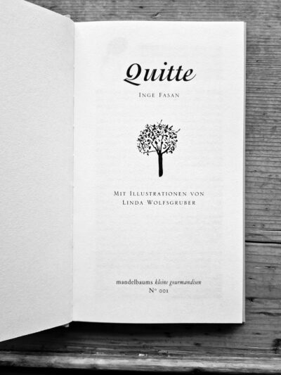 Inge Fasan ist die Autorin und, wie man unschwer heraus lesen kann, eine Quitten-Liebhaberin. In ihrem Büchlein, in der Reihe der „kleinen gourmandisen“ des Mandelbaumverlags die Nr. 1, schreibt sie über ihre persönlichen Erfahrungen mit der Quitte, über Herkunft und Historie, über Bedeutung und Mythologie. Daten und Fakten sind ebenso vorhanden wie amüsante Anekdoten. Interessante Details zur Heilwirkung sowie köstliche Rezeptideen ( z.B. Wintersalat mit Quittenspalten, Kalbsleber mit Salbei-Quitten, gefüllte Quitten, Quittentarte u.v.m.) findet man im hinteren Teil des Buches.